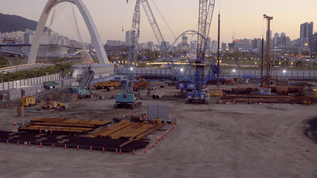 물가에서 볼 수 있는 도시의 건설 현장