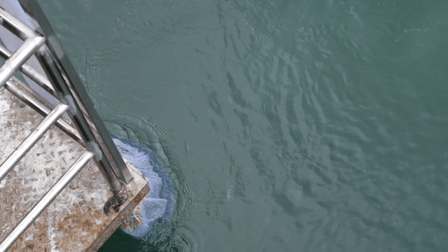 그물로 파란 물탱크에서 생선을 건져 올리는 장면