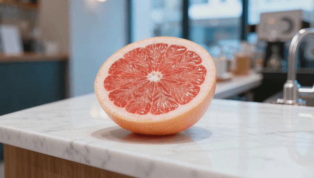 대리석 카운터 위의 자몽 반쪽