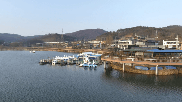 맑은 날 잔잔한 백운호수에 정박한 작은 보트들