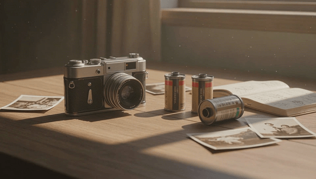 테이블 위의 빈티지 카메라와 오래된 가족 사진
