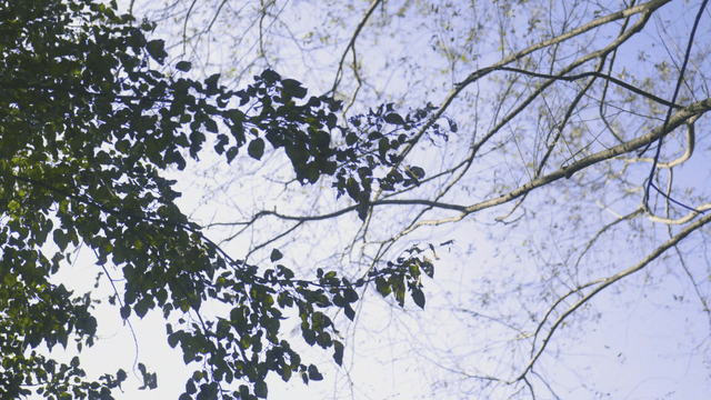 밝은 하늘을 배경으로 한 녹색 나뭇가지