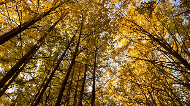 맑은 하늘 아래 황금빛 가을 잎