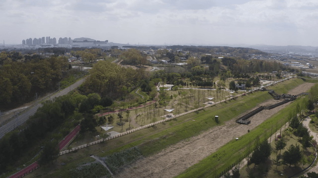 놀이터와 산책로가 있는 공원의 항공 뷰