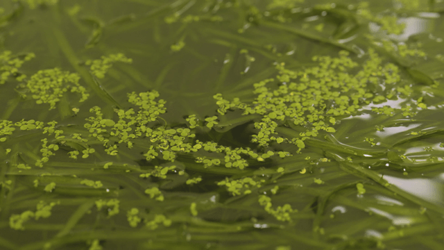 작은 녹색 수생 식물과 수련이 있는 고요한 연못