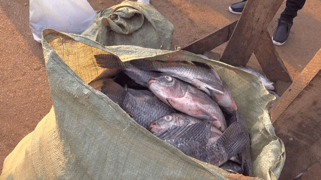 분주한 시장에 진열된 신선한 생선 바구니