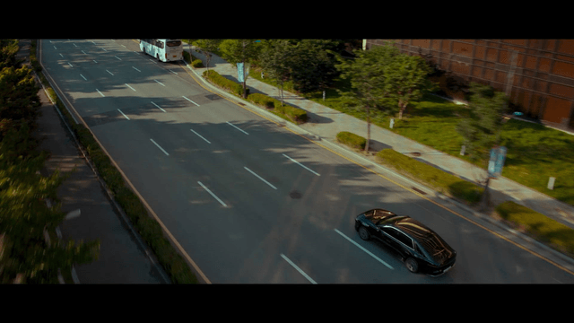 울창한 숲으로 둘러싸인 도로를 달리는 자동차