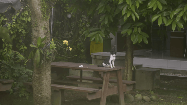 숲속 나무 테이블 위의 고양이들
