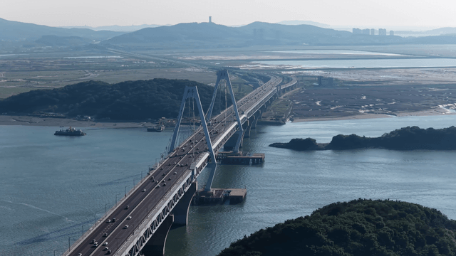 눈서리가 내리는 흐린 날의 강 위 다리 풍경