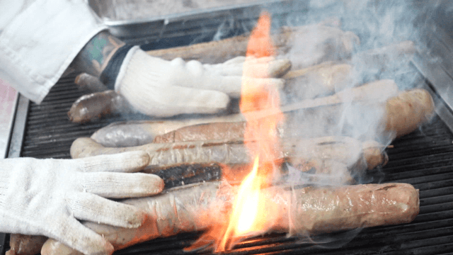 그릴에서 장갑으로 돌려지며 구워지는 막창 순대